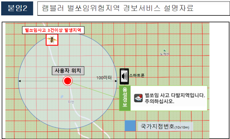 □ 이에 소방청은 15년간의 구급출동데이터(2007~2021, 약 6만3천 건)를 분석하여 도출한‘전국 벌쏘임 다발 지역(3회 이상 벌쏘임 발생 지역)’1,767개소를 기반으로, 등산길 안내 어플 (램블러/www.rambir.com)과 협업을 통해‘벌쏘임 위험경고 음성메시지 서비스’를 제공한다.